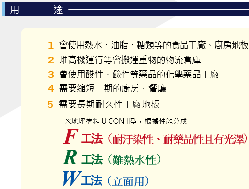 1.適用於需承受熱水、油脂、糖類等物質的場所,如食品工廠與廚房地面。
