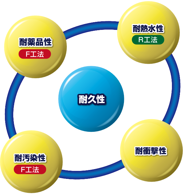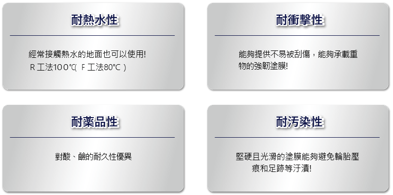 1.適用於長期接觸熱水的地面:R工法可耐100℃,F工法可耐80℃。